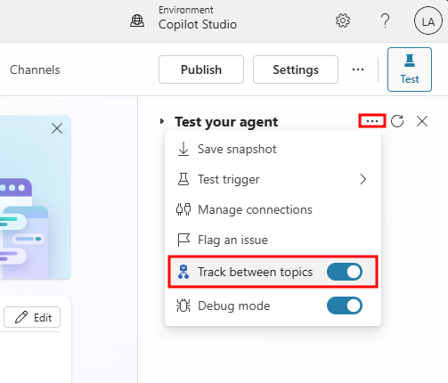 The Test your agent window interacts with your agent topics just as a user would. As you enter text into the test agent window, information is presented as it would be to a user. Your agent likely contains multiple topics. As you engage with a specific topic, it might be handy to have the application take you to that topic. You can accomplish this task by setting Track between topics to On at the top of the test window. This option follows along with the agent as it implements the different topics. For example, typing "hello" would trigger the Greeting topic, and then the application opens the Greeting topic and displays its conversation path in the window. If you type "What time is your store open?" the application switches to display the Store Hours topic. As each topic is displayed, you can observe how the path progresses, which help you evaluate how your topics are doing.