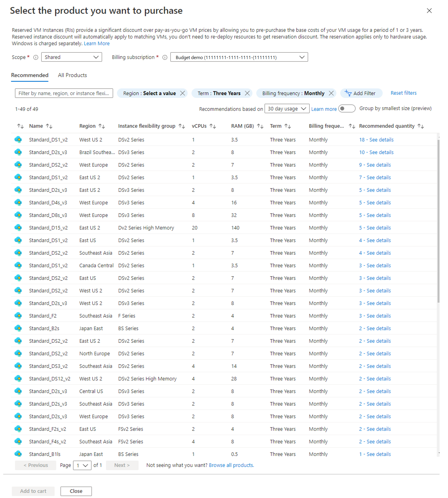 Select the product that you want to purchase reservations for. The Select the product you want to purchase pane appears. Azure recommends products and quantities that maximize your savings.