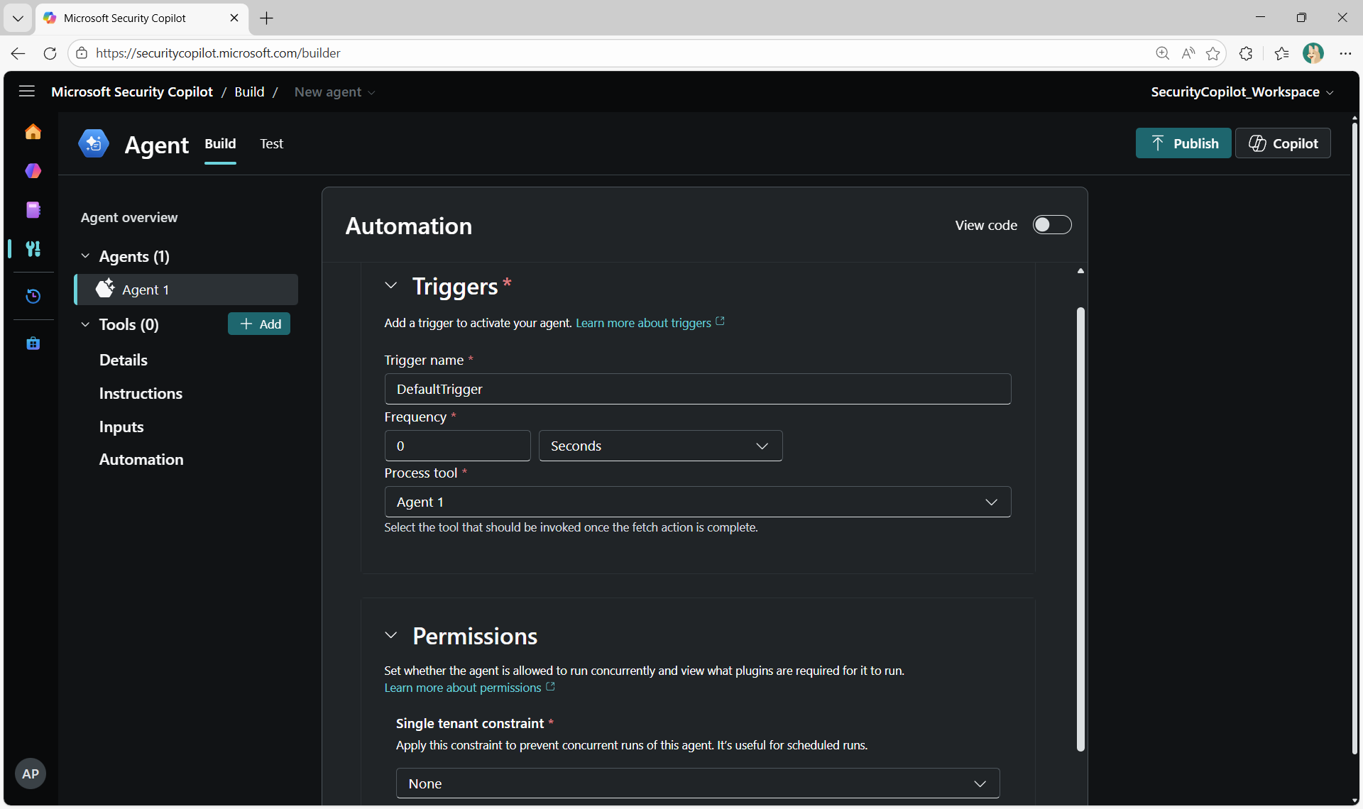 - Automation - Set up triggers to activate the agent on a schedule, and configure permissions including single-tenant constraints (Tenant, Workspace, or None).