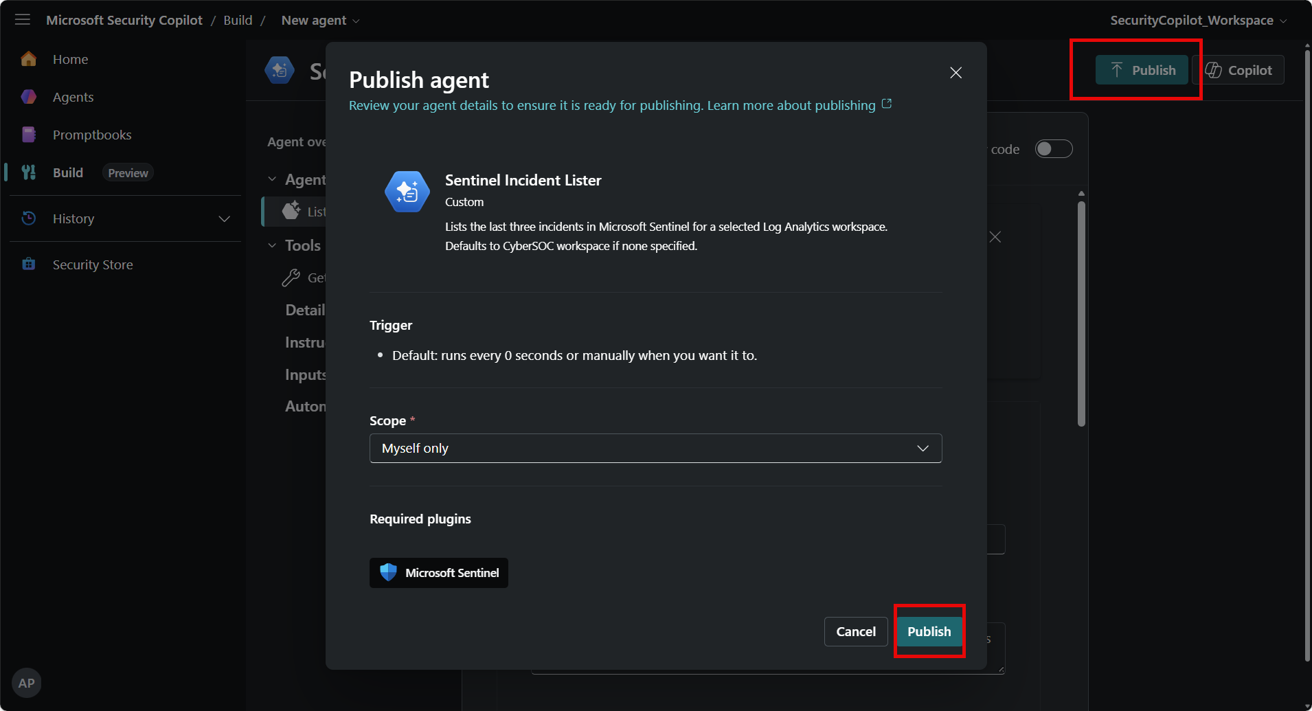 - Deploy the agent to Security Copilot at user scope or workspace scope.