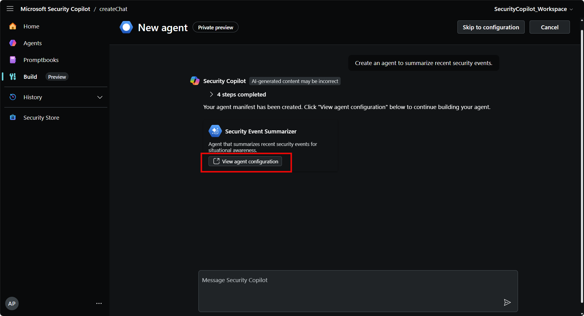 - From the home page of the Security Copilot portal, select Build