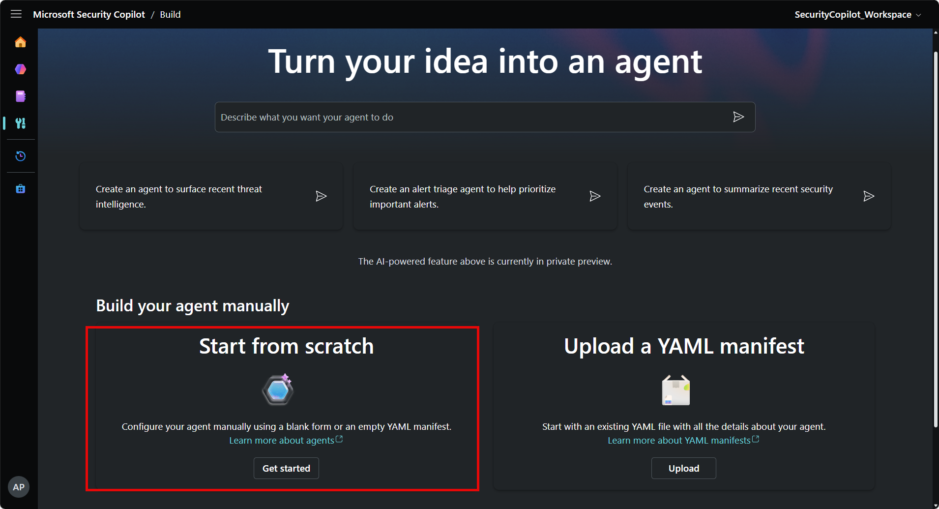 | Standalone experience | The standalone experience supports three different ways of creating an agent: 1. NL2Agent: Build agents simply by describing what you want in natural language. 2. Create an agent from scratch using agent builder: Configure agents using the agent builder interface in the Security Copilot platform. 3. Upload YAML: Build a YAML in your Integrated Development Environment (IDE) of choice and upload it to Security Copilot. |