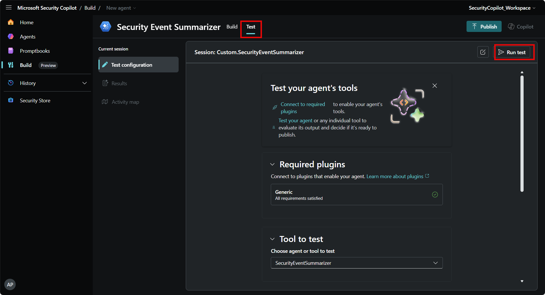 The agent builder provides a comprehensive form-based experience for creating agents from scratch using the Security Copilot platform's graphical interface. On the top navigation bar, there are two tabs: Build and Test. Use the Build tab to define your agent and configure its tools. The Test tab lets you validate the agent's responses, but you must currently first publish your agent before you can test it.