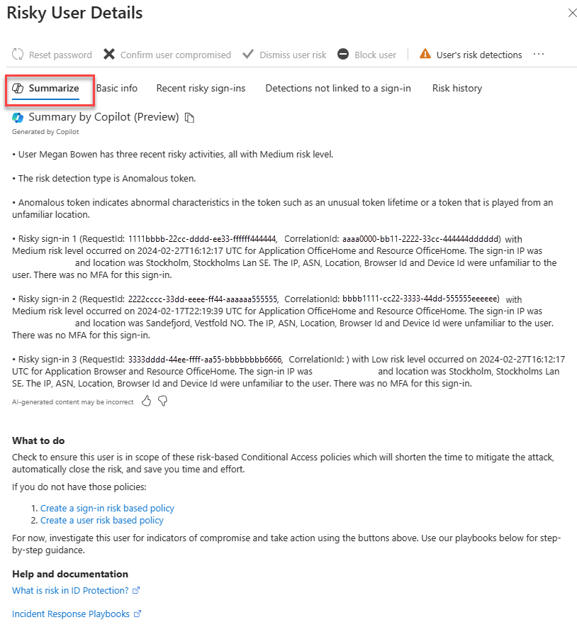 - Summary by Copilot: summarizes in natural language why the user risk level was elevated.