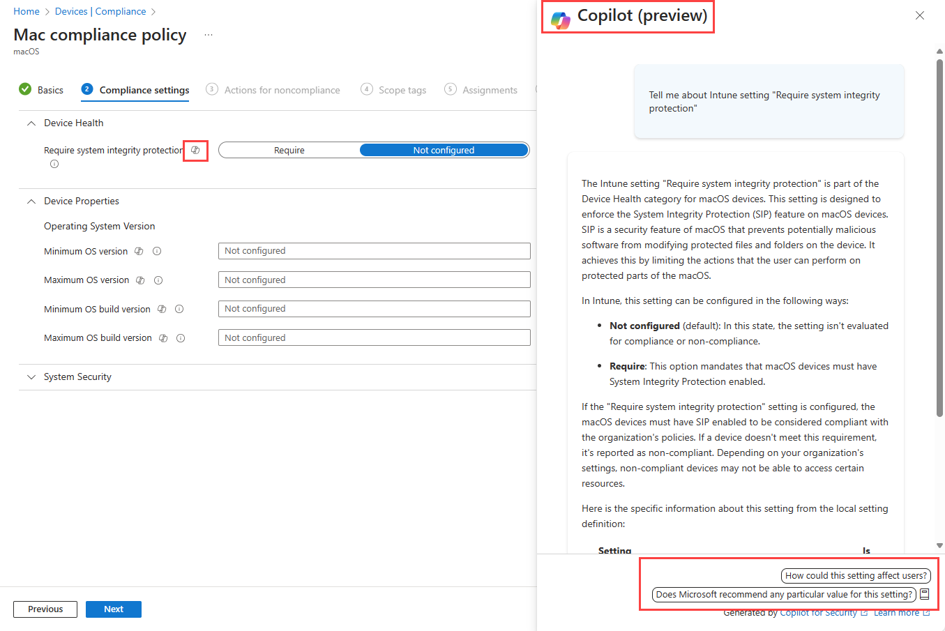 When you create a new policy, you can use Copilot to learn more about individual settings, their impact, and recommended values by using the Copilot tooltips.
