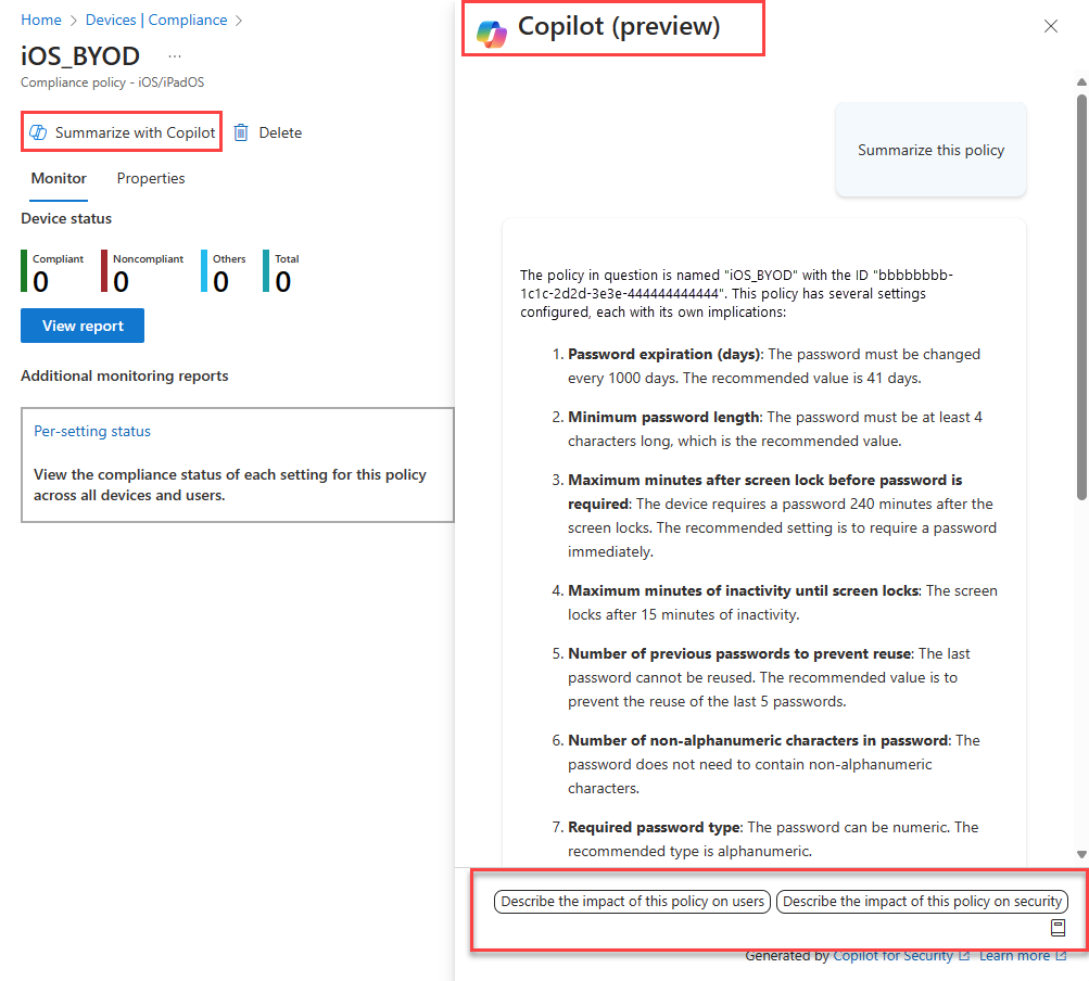 From an existing policy, you can use Copilot to summarize the policy. The summary describes what the policy does, the users and groups assigned to the policy, and the settings in the policy. This feature can help you understand the impact of a policy and its settings on your users and devices.