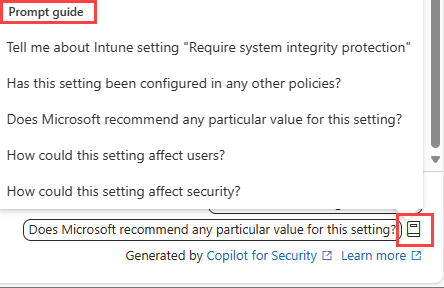 Whether you're using Copilot to learn about the settings for a new policy or summarizing an existing policy, the Copilot window provides more prompts that you can use. You can also select the prompt guide icon on the bottom right and select from an existing list of prompts.