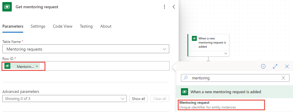 Select the trigger of the flow and change the name to When a new mentoring request is added.