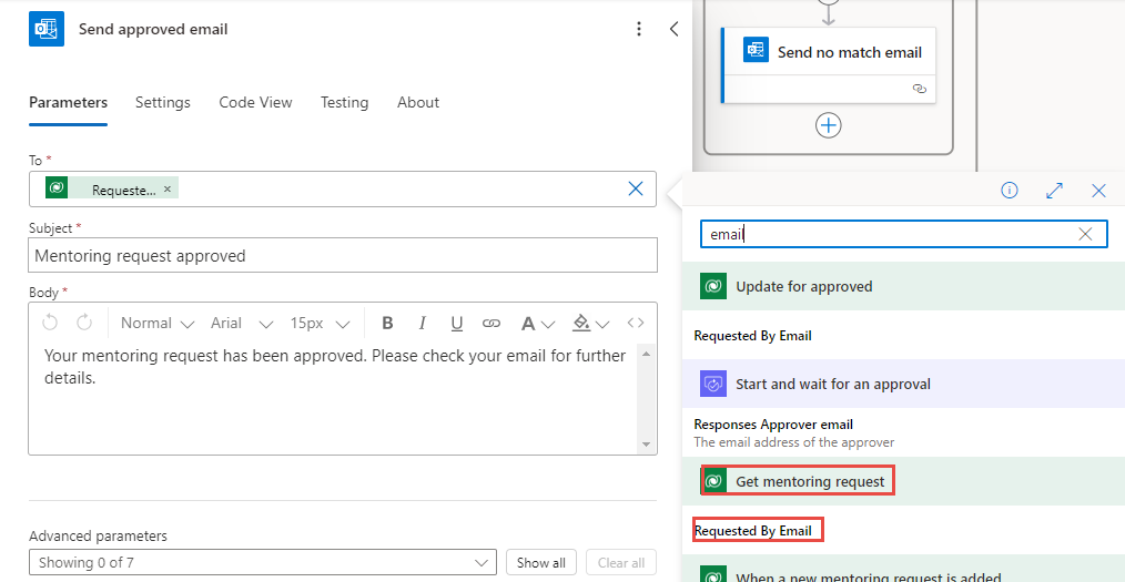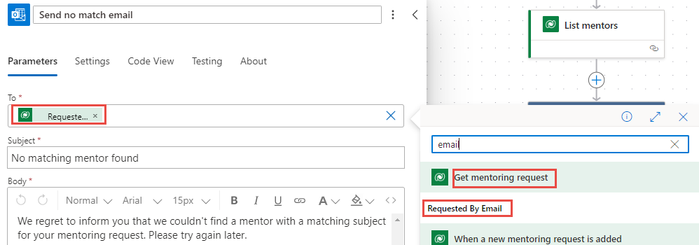 Select Requested By Email of the Get mentoring request step from the Get mentoring request action. Usually, this request goes to the person who manages mentoring requests, but to make testing easier, you use the requester's email for this exercise.