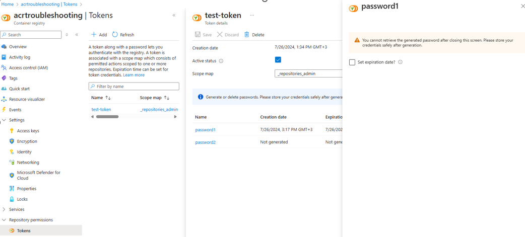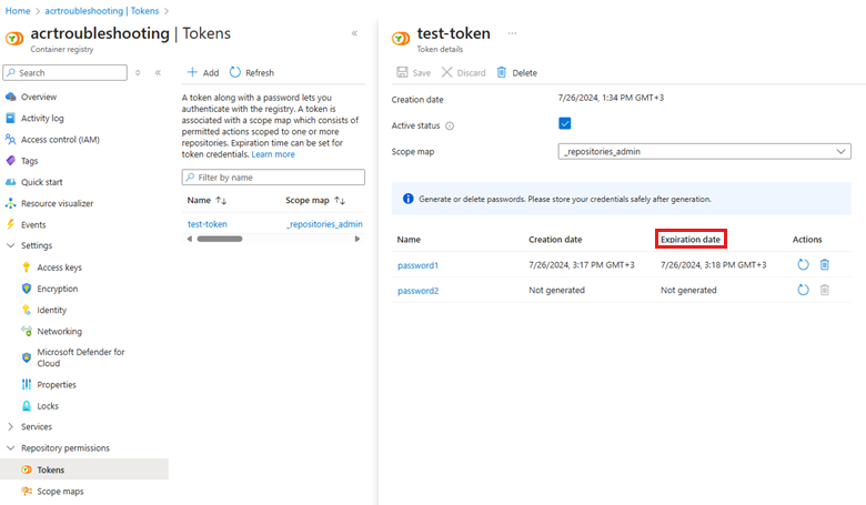 If you're using a token associated with a scope map, an expiration date can be set for the password. To view the expiration date, you can run the Azure CLI commands described in Show token details, or open the token in the Azure portal and check the Expiration date as per the following screenshot: