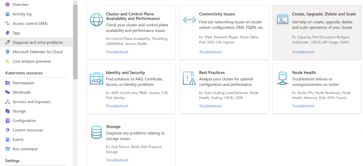 In the Azure portal, navigate to your AKS cluster resource and select Diagnose and solve problems from the left menu. You'll see a list of categories and scenarios that you can select to run diagnostic checks and get recommended solutions.