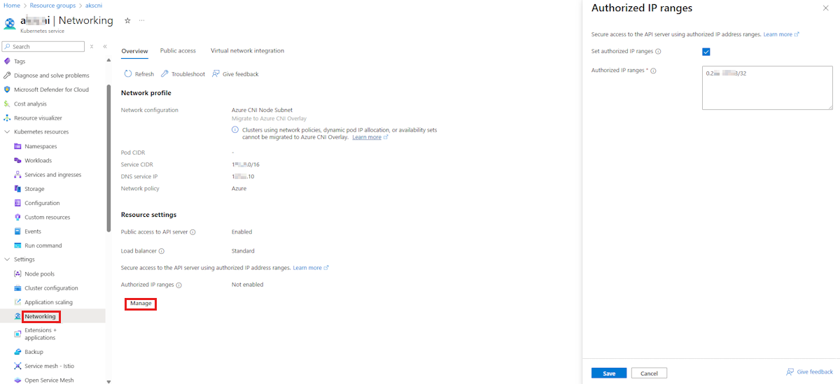 API server-authorized IP ranges may have been enabled on the cluster's API server, but the client's IP address wasn't included in the IP ranges. To check whether this feature has been enabled, see if the following az aks show command in Azure CLI produces a list of IP ranges: