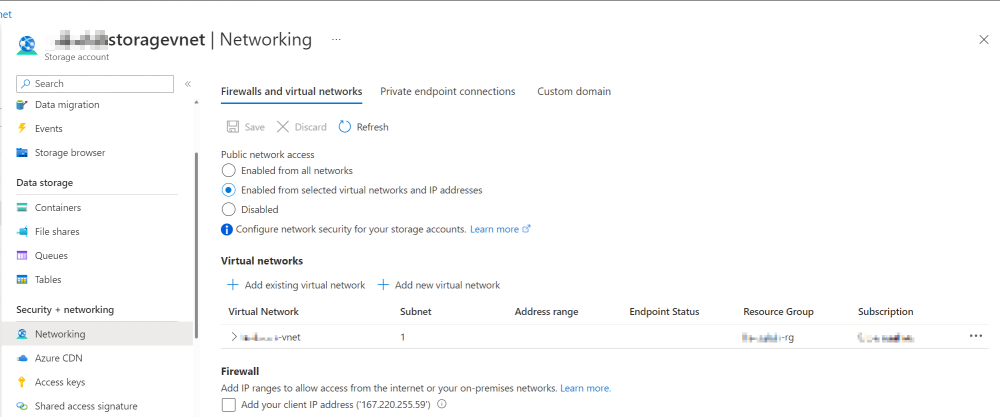 Navigate to the storage account, and select Networking. In the Firewalls and virtual networks setting, select Enable from selected virtual networks and IP addresses for Public network access. Add the Batch pool's subnet in the firewall allowlist.