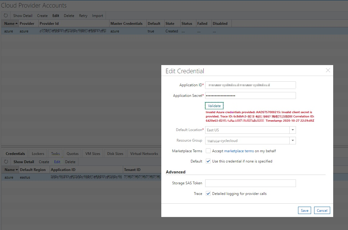 Go to the CycleCloud portal and select Configure. Select the account in Cloud Provider Accounts, and then select Credentials > Edit. In the Edit Credential dialog, enter the password in Application Secret, and then select Validate. If the validation succeeds, select Save.