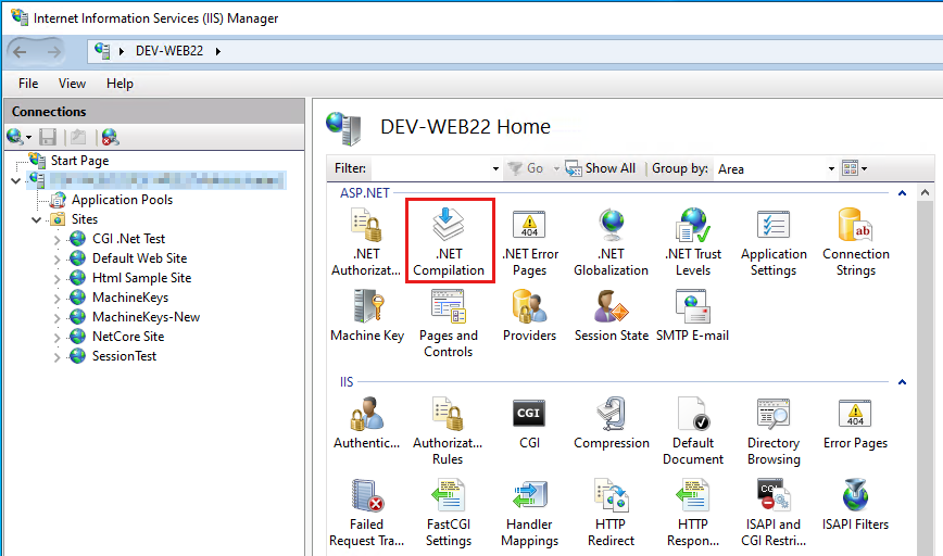 From the middle pane of IIS Manager, select the .NET Compilation icon: