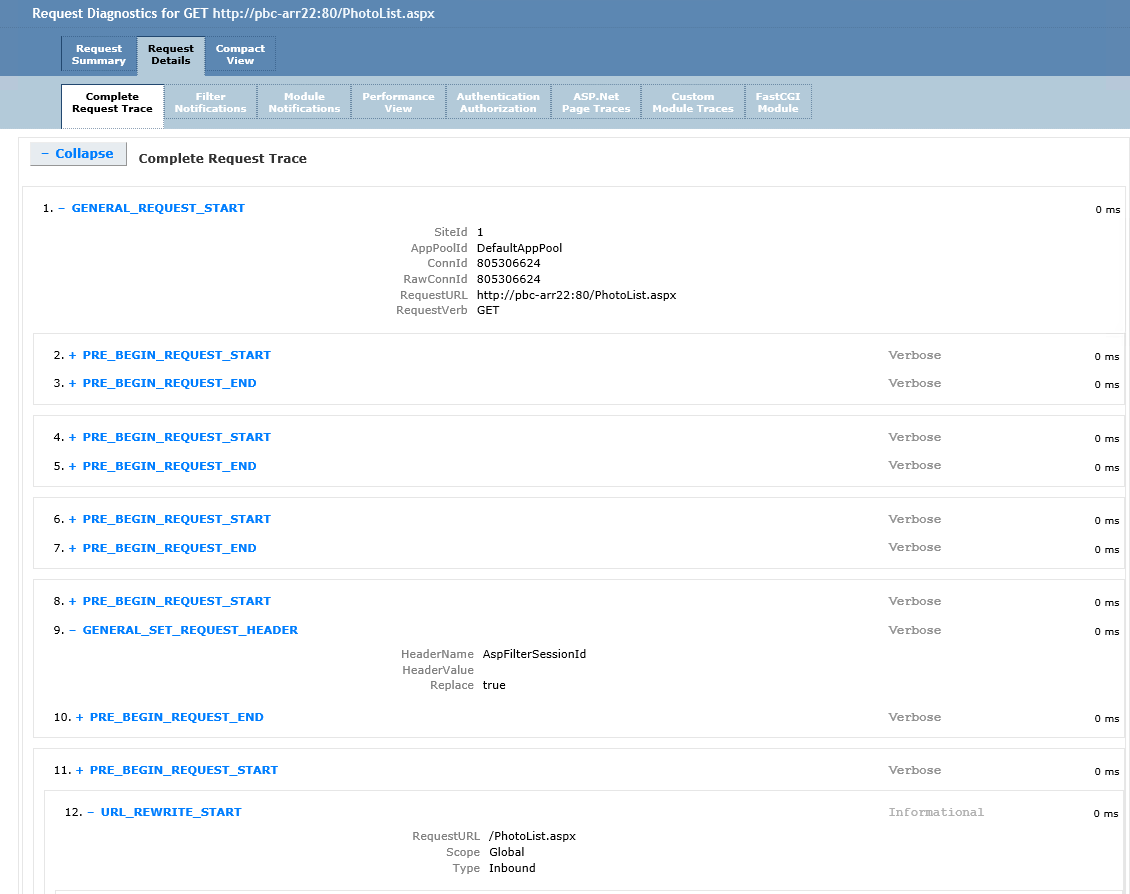 6. Open the XML file. Select Request Details. Select Complete Request Trace, and then Select Expand All. The following image is an example of a Failed Request Tracing log for Application Request Routing: