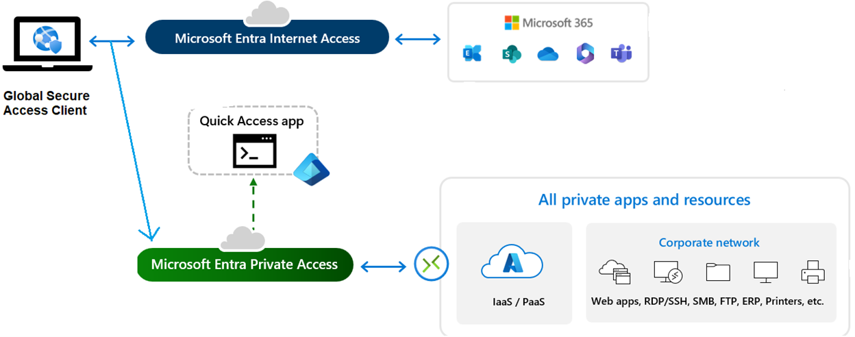 The Global Secure Access client is deployed on a managed Microsoft Windows device (that is, a Microsoft Entra hybrid join device or a Microsoft Entra joined device). It enables an organization to control network traffic between these devices and various websites, applications, and resources that are available on the internet or an intranet (on-premises corporate network). If you use this method to route traffic, you can enforce and apply more checks and controls, such as continuous access evaluation (CAE), device compliance, and multi-factor authentication, for resource access.