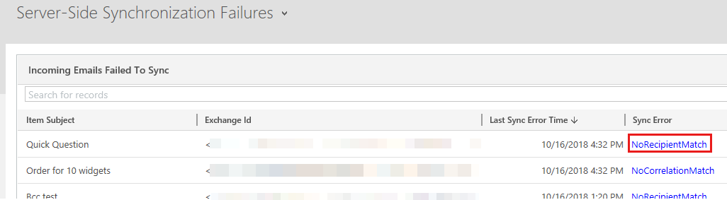 A new Server-Side Synchronization dashboard has been introduced that enables you to view item level failures for incoming email, outgoing email, and ACT (Appointments, Contacts, and Tasks) sync. This can help you troubleshoot issues such as why a specific email wasn't tracked automatically by Server-Side Synchronization.