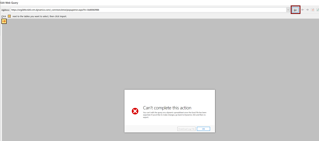 Enter the following link in the address bar of the Edit Web Query window to access the Advanced Settings page in Microsoft Dynamics 365 Customer Engagement. Remember to replace