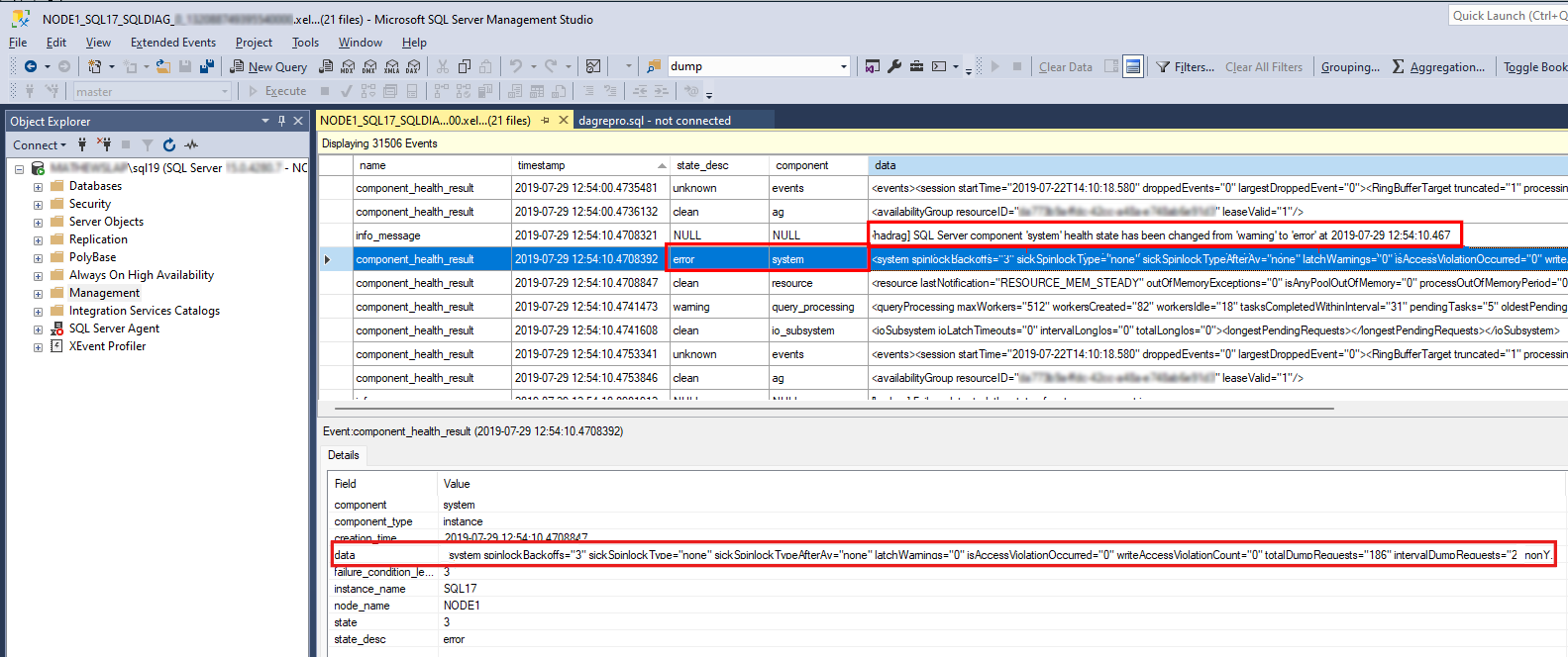 component_health_resultwhosestate_descvalue iserror. Here's an example of a system component event that reported an error back to Always On health monitoring:Double-click the data column in the lower pane. This opens the detailed component data in a new SSMS window pane for review. Here's what the system component data looks like: