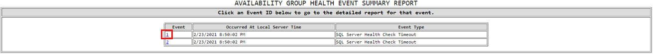 The summary report lists the availability group health events from the cluster log. To jump to a specific health event's detailed report, select the numerical link (highlighted in red box in the following image).