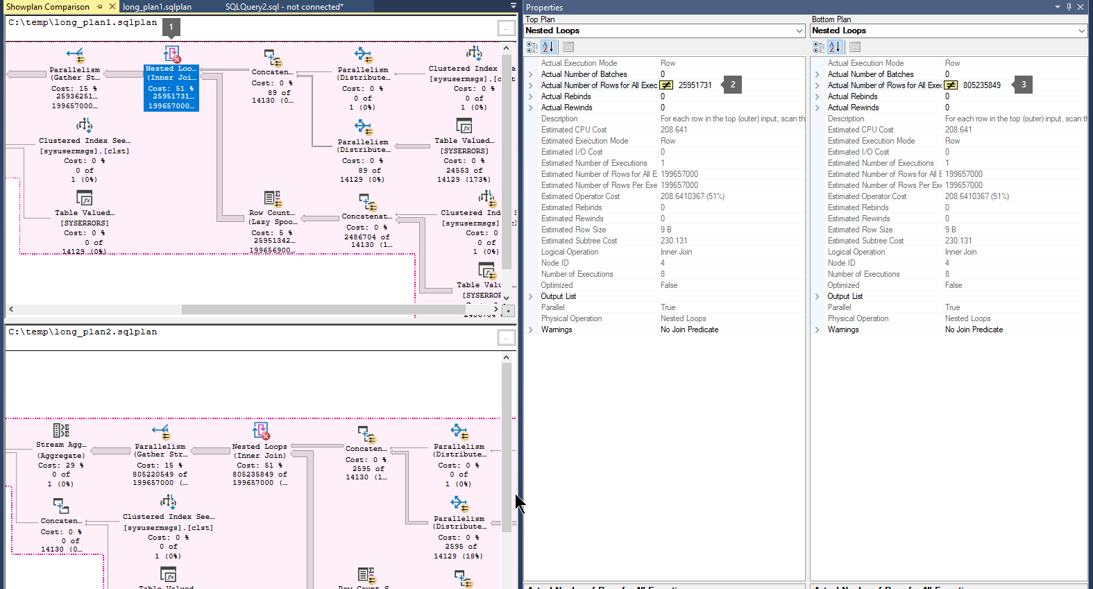 Look for thick arrows that indicate a large number of rows flowing between operators. Then, select the operator before or after the arrow, and compare the number of actual rows across the two plans.