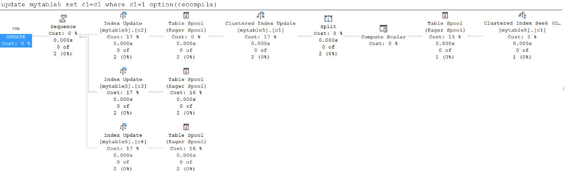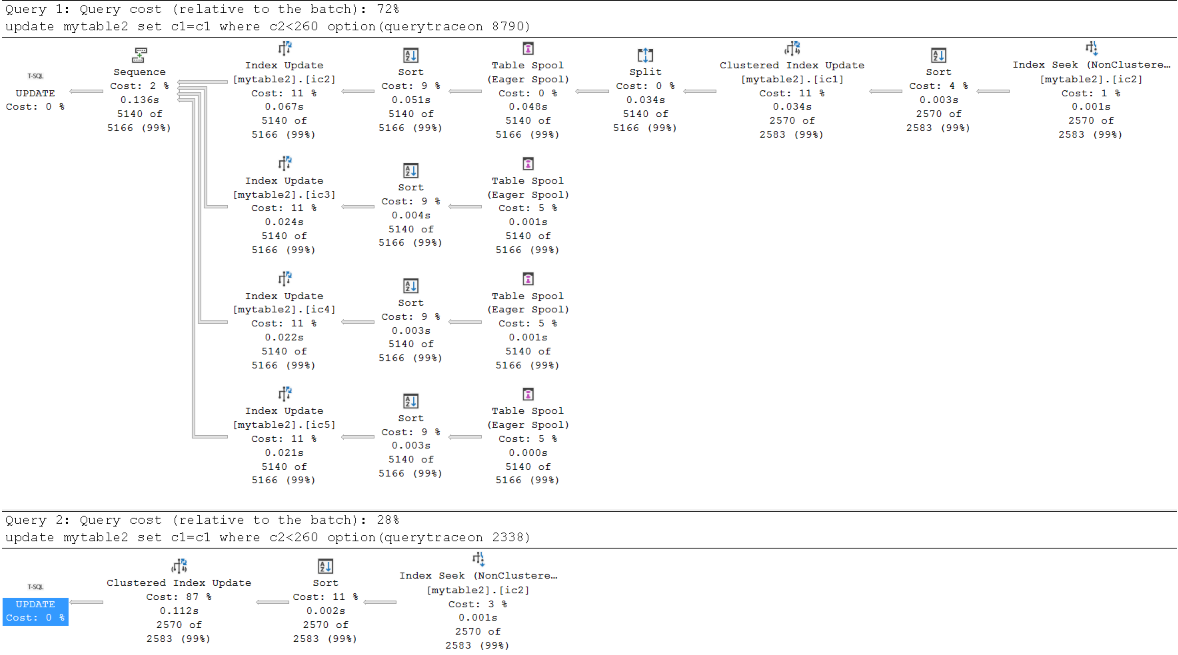 CHECKPOINT GO DBCC DROPCLEANBUFFERS go UPDATE mytable3 SET c1=c1 WHERE c2<12 OPTION(QUERYTRACEON 8790) --tf 8790 will force Wide plan CHECKPOINT GO DBCC DROPCLEANBUFFERS GO UPDATE mytable3 SET c1=c1 WHERE c2<12 OPTION(QUERYTRACEON 2338) --tf 2338 will force Narrow planThe duration of both queries is reduced significantly! The wide plan takes 0.304 seconds, which is a bit slower than the narrow plan this time.