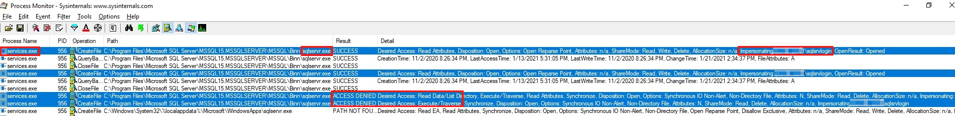 You can also use Process Monitor tool to identify and isolate the permission issues. The following screenshot of an example output from Process Monitor shows the <DomainName>\sqlsrvlogin SQL Server service account generating an Access Denied error.