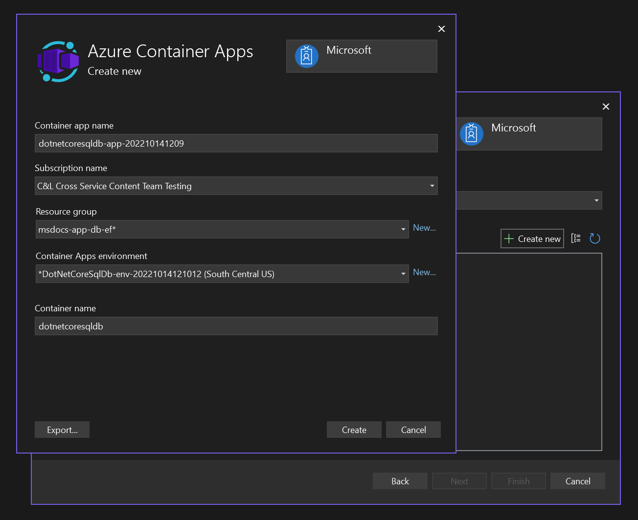 • Select Create to close the original container apps dialog. Visual Studio creates the container app resource in Azure.