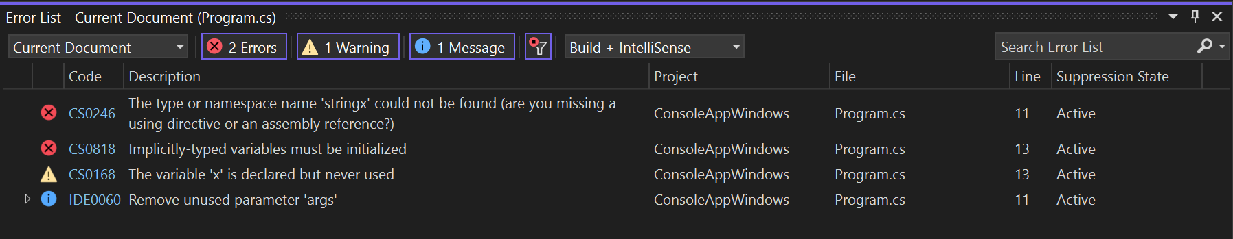 If an analyzer finds any analyzer rule violations, it reports them in the Error List window and in the code editor.
