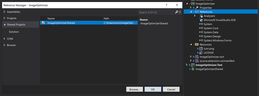 2. On your new VSIX project, add a reference to the same shared project that your Visual Studio 2019-targeting VSIX references.