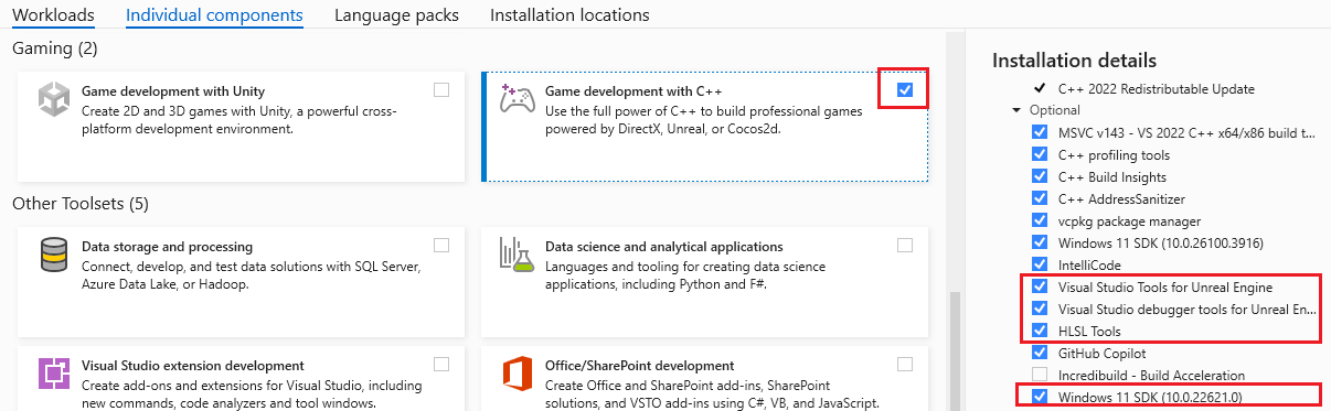 In the Installations details pane, ensure that under Game development with C++ > Optional that the following are selected: