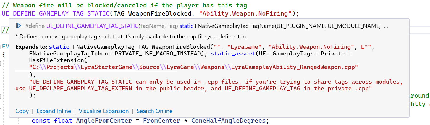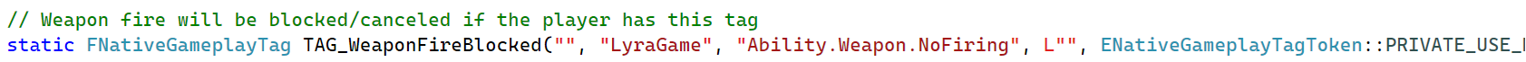 LyraGameplayAbility_RangedWeapon.cpp, go to line 41. You should see the following macro:UE_DEFINE_GAMEPLAY_TAG_STATIC(TAG_WeaponFireBlocked, "Ability.Weapon.NoFiring");Hover the mouse pointer over