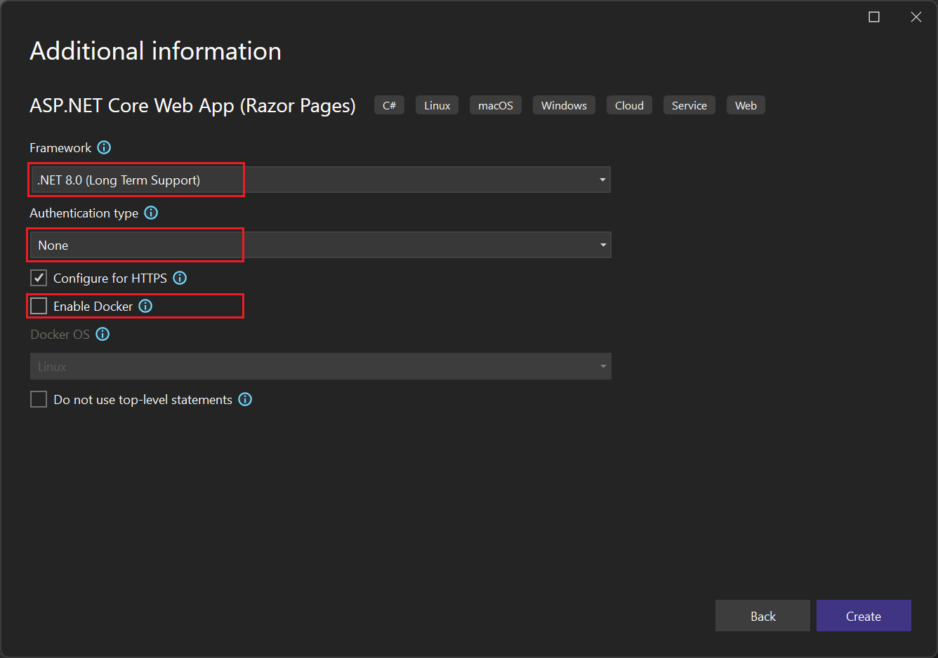 Screenshot that shows the default settings in the Additional information window where the target framework is set to .NET 8.0.