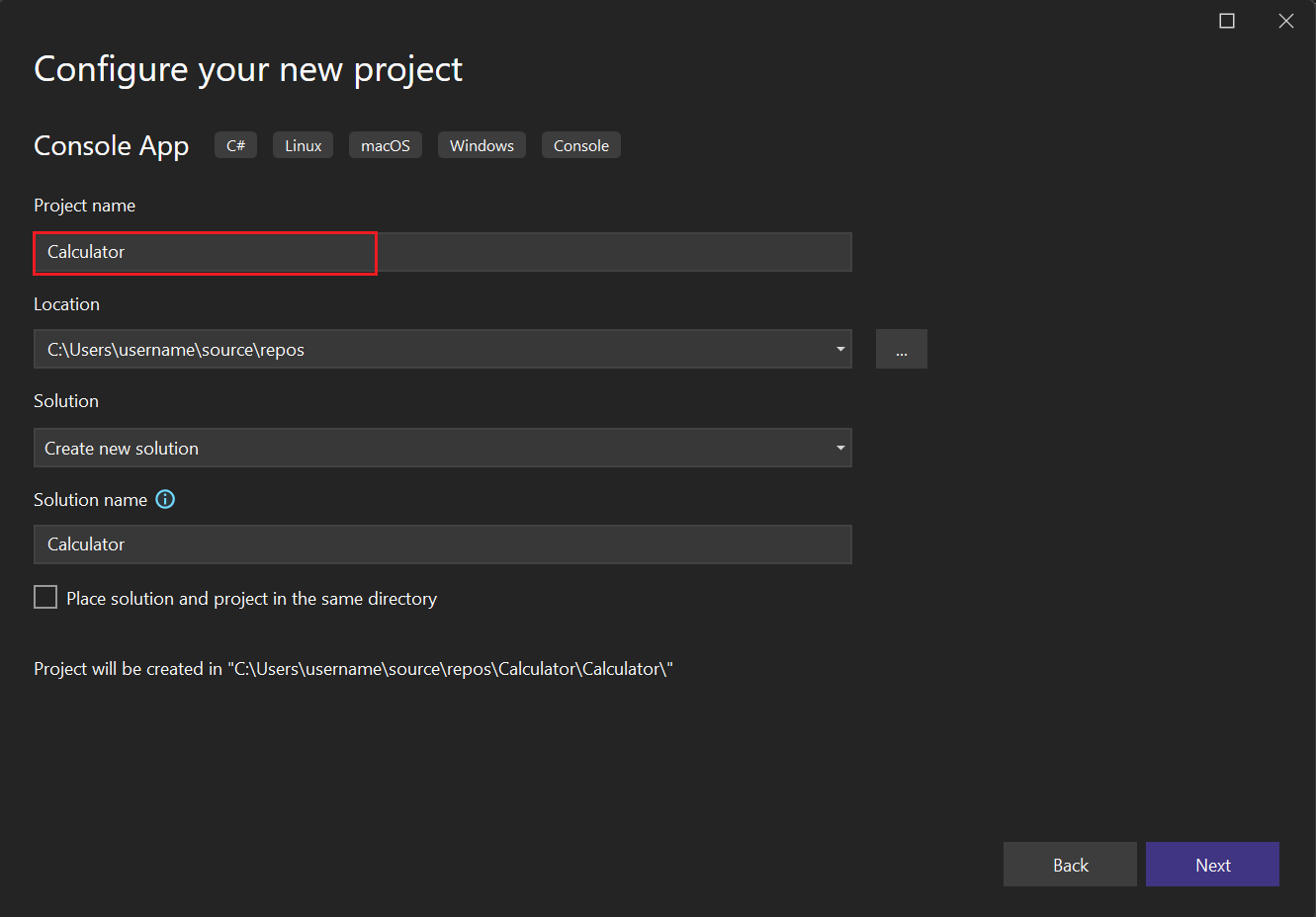 In the Configure your new project window, type or enter Calculator in the Project name box, and then select Next.