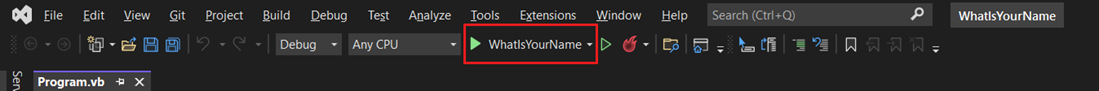 After you select your Visual Basic project template and name your project, Visual Studio creates a Program.vb file. The default code calls the WriteLine method to display the literal string "Hello World!" in the console window.