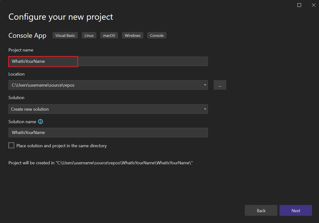 In the Configure your new project window, enter WhatIsYourName in the Project name box. Then, choose Next.