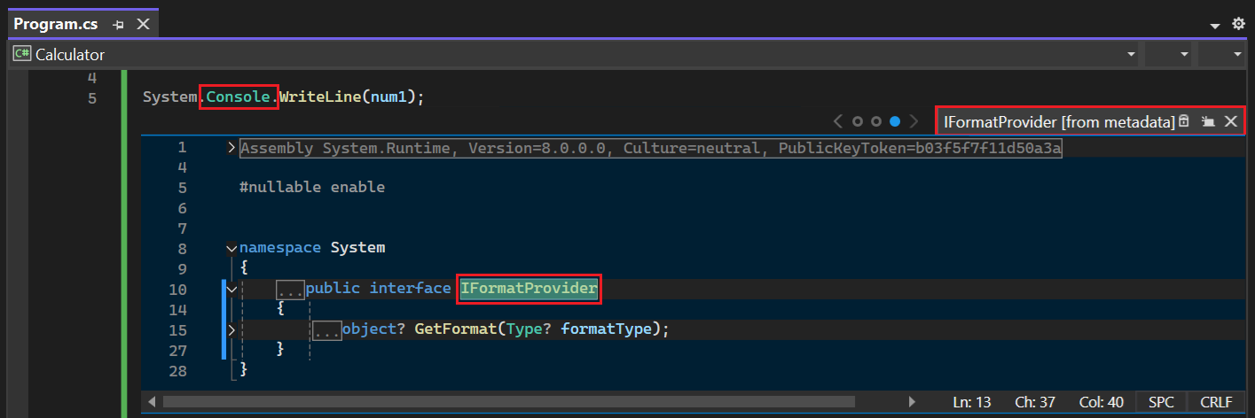 When you try to look at the definition for a C# type or member and the source code isn't available, Visual Studio shows metadata for the symbol instead. You can see the declarations of the types and members, but not their implementations. The tab label for the window includes the symbol name followed by [from metadata]: