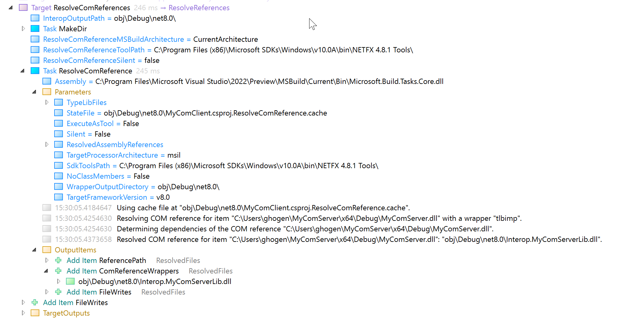 Here's the view of the ResolveComReferences target in the structured log viewer. You can inspect the parameters and outputs, which represent the resolved reference paths and wrapper assemblies. In this example, the wrapper assembly location is expanded to show the location and filename of the generated wrapper assembly.