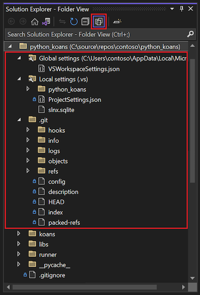 4. When you open a Python folder, Visual Studio creates several hidden folders to manage settings related to the program. To see these folders (and any other hidden files and folders, such as the .git folder), select the Show All Files toolbar option: