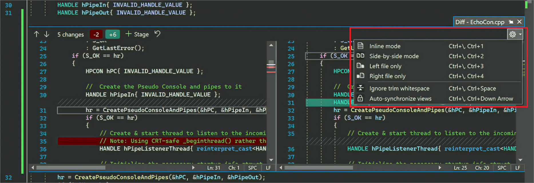 If you prefer an inline difference view, you can use the Settings control in the top-right corner of the Diff editor to switch to Inline mode.