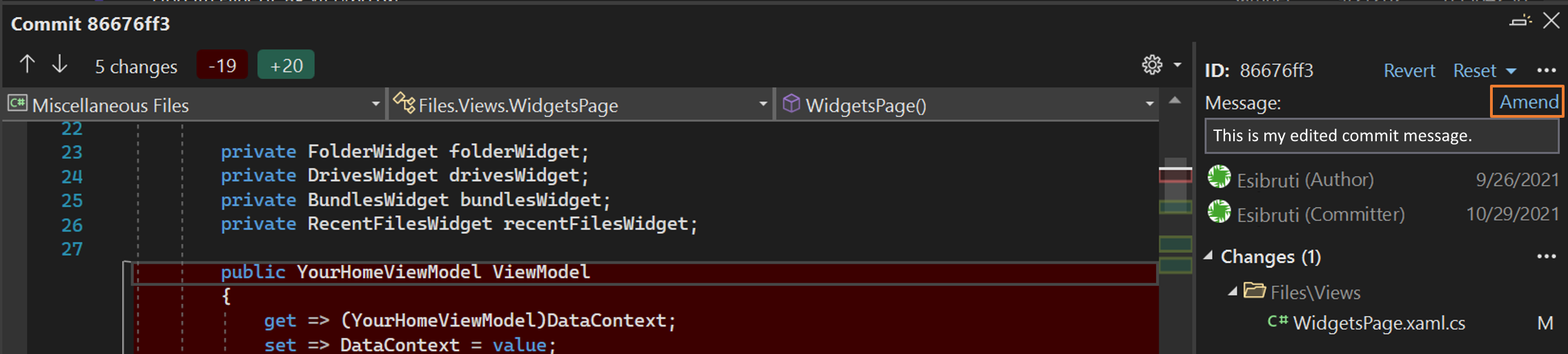 The Git Repository window makes it easy to update your most recent commit message. Open the commit details of the last commit by double-clicking it, and then select the Edit option next to the commit message.