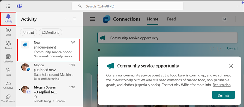 When in Microsoft Teams, the announcement also appears in the Activity tab. Selecting the announcement opens it within the Connections experience.