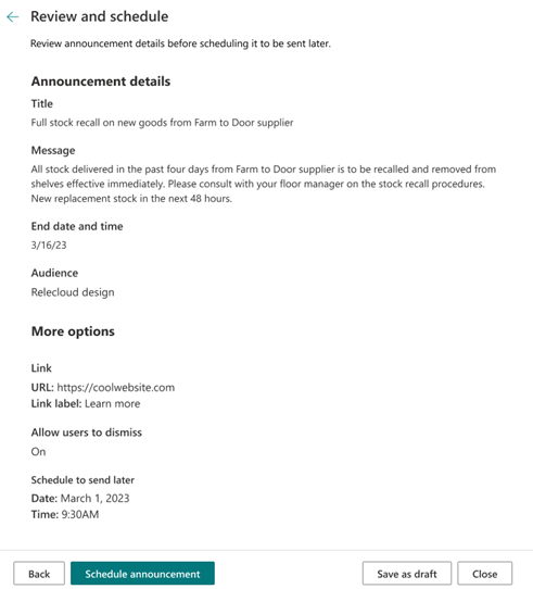 - Use audience targeting to specify which audiences need to receive the announcement to ensure the highest engagement possible.
