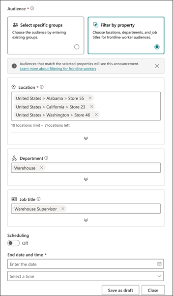 After location, department, and role values have been set up in Microsoft Teams, and regional filtering is enabled in Viva Connections, owners and members will see options to filter their announcement based on the new set of frontline worker properties created in Microsoft Teams.