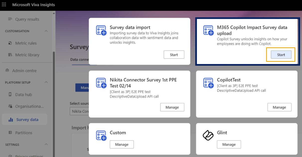 Under M365 Copilot Impact Survey data upload, select Start. If you previously uploaded survey data, this new import will replace the old data.