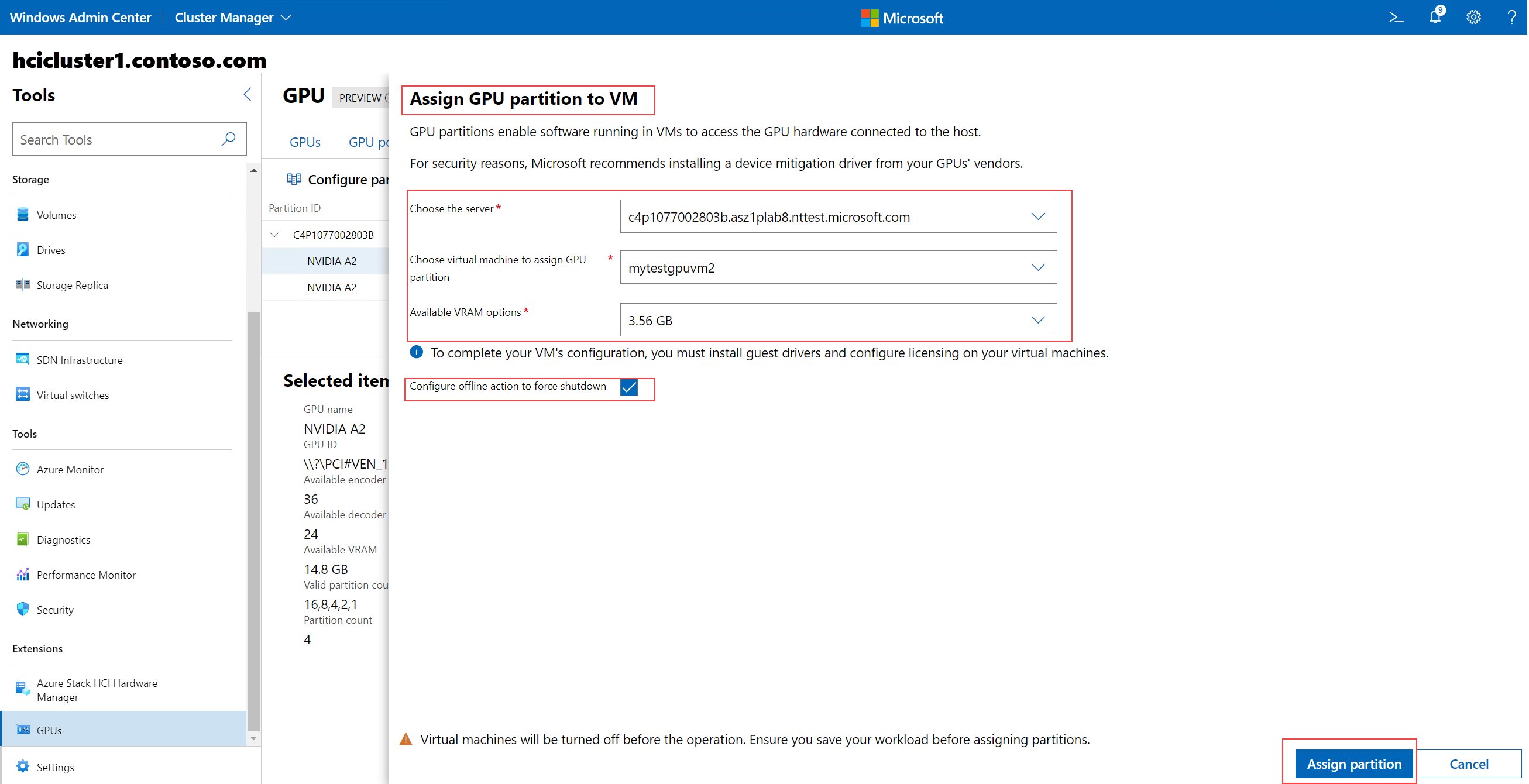 You must save your workloads before assigning partitions. If your VM is currently turned on or running, Windows Admin Center automatically turns it off, assigns the partition, and then automatically turns it on.
