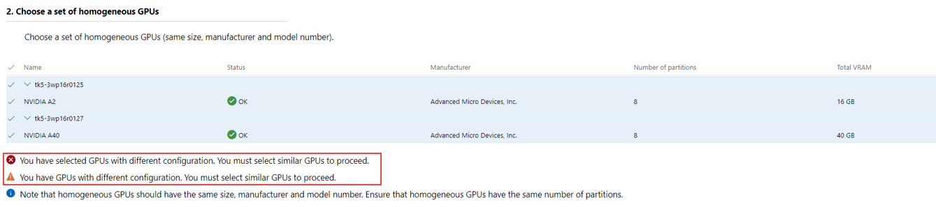 Warning. If not all the GPUs across all the servers have the same configuration, Windows Admin Center gives a warning. You must manually select the GPUs with the same configuration to proceed further.