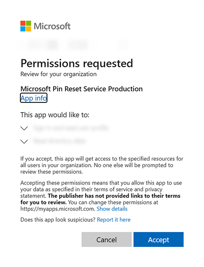 - Go to the Microsoft PIN Reset Service Production website, and sign in as at least an Application Administrator. Review the permissions requested by the Microsoft Pin Reset Service Production application and select Accept to give consent to the application to access your organization