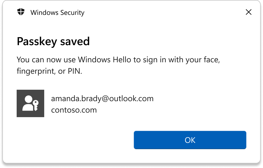 You can use passkeys with any applications or websites that support them, to create and sign in with Windows Hello. Once a passkey is created and stored with Windows Hello, you can use your device's biometrics or PIN to sign in. Alternatively, you can use a companion device (phone or tablet) to sign in.